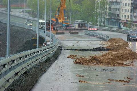 Во Владивостоке рассыпалась недавно построенная для мероприятий саммита АТЭС автодорога, ведущая от аэропорта Владивостока на о. Русский. По сообщениям, мост, являющийся частью трассы, в районе улицы Космонавтов осыпался и засыпал местный пляж, а остатки насыпи засыпали прибрежные гаражи, сообщается на сайте NR2.ru (http://nr2.ru/fareast/390836.html). Жители района бухты Тихой оказались отрезаны от пляжа. Ожидалось, что четырехполосная дорога протяженностью 40 км, построенная к Саммиту АТЭС, свяжет аэропорт Владивостока с островом Русский и разгрузит от пробок выезд из Владивостока в сторону аэропорта.