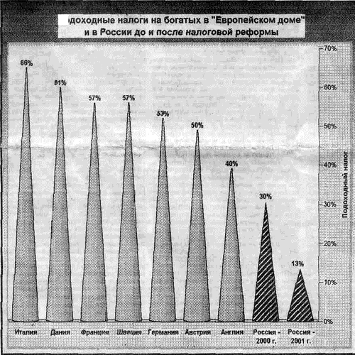 Подоходный налог. Личные доходы облагаются государственным подоходным налогом. Сегодня он пока еще имеет прогрессивный характер: чем больше доход, тем выше налог. Нищета, бедные, малообеспеченные отдают бюджету 12 % своего заработка, состоятельные, богатые и выше - 30 %. Таков закон. Чтобы было нагляднее, поясним: у бедного сегодня вычитается до 180 рублей, в то время как у богатого от 9 000 и до 22 500 рублей ежемесячно. Но так как закон в условиях "демократии", "свободы" и "прав человека" не действует, то богатые дружно превратились в налогонеплательщиков. Освободили себя от бремени кормить государство. В новой Думе большинство перешло на сторону защитников интересов богатых, и вот уже они одобрили предложение узаконить уклонение от налогов, сделали его законным. В этом главное содержание нового налогового кодекса, который подписан президентом и вступает в силу с нового года.
