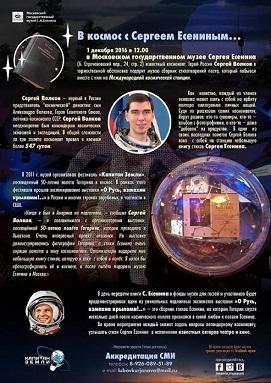 Космонавтам разрешается брать с собой в космос не более 1,5 кг. личных вещей. Сергей Волков в числе других дорогих ему предметов, взял книгу Есенина, которую ему подарили в 2011 году в США организаторы российской выставки «О Русь, взмахни крылами!..». Космонавт заметил, что поэзия Сергея Есенина очень хорошо сочетается с космической темой. Кстати, один из экспонатов той выставки будет представлен 1 декабря в Музее Есенина в столице. Это – сборник стихов Есенина с надписью Гагарина, сделанной всего спустя несколько дней после его легендарного космического полета вокруг Земли.