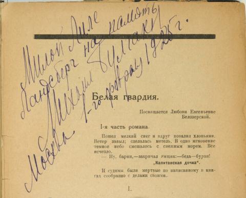 Уникальные предметы из частного архива, связанного с именем Михаила Булгакова, в частности - первое издание первого романа «Белая гвардия» в журнале «Россия» (1925) с автографом писателя будут выставлены 27 марта на аукционные торги «В Никитском». Также на аукционе будут выставлены рукописи, автографы, письма Михаила Булгакова и его окружения.
