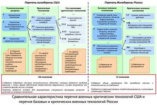 Сравнительная характеристика перечня военных критических технологий США и базовых технологий России[13].