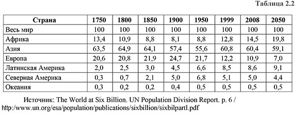 По мере значительного сокращения доли Европы в общей численности населения Земли, доля Азии в обозримой перспективе будет оставаться стабильной – на уровне 60% от общего населения (см. табл. 2.2.)