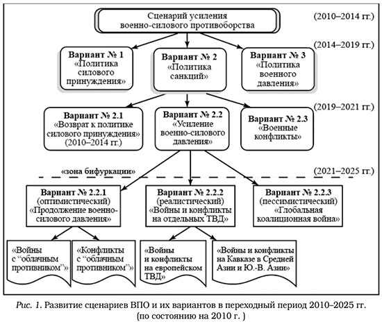 Таким образом, базовый сценарий развития военно-политической обстановки до 2025 г. может пойти по трём конкретным вариантам этого сценария (рис. 1), хотя в среднесрочный период 20252035 гг. эти варианты могут быть существенно скорректированы в случае резкого обострения ВПО в сторону усиления прямого военного противоборства либо неожиданного «замирения» в рамках западной коалиции.