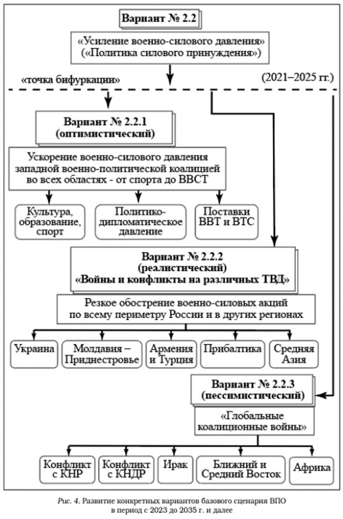 В-четвёртых, крайне важно вычленить доминирующие конкретные варианты базового сценария, от которых зависит эффективное использование как невоенных, так и собственно военно-силовых инструментов, в частности, тех или иных видов и систем ВВСТ, видов и родов войск и т. д. Развитие МО и ВПО по Варианту № 2.2.2 показало, что в целом ряде областей соперничества Россия оказалась не готова к военному противоборству не только на отдельных ТВД (например, в Молдавии, Прибалтике, на северо-западе, в Армении), но и с ВС Украине при такой масштабной помощи Запада.