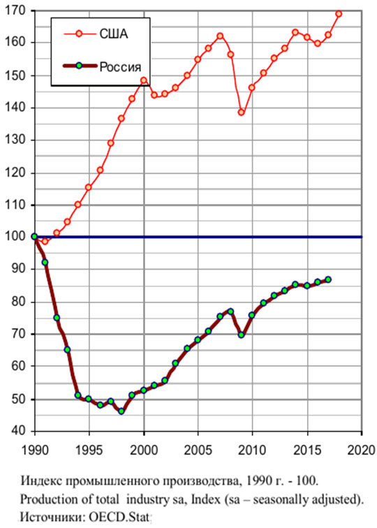 Нетрудно заметить, что развитие ВС и военной промышленности (и обрабатывающей промышленности вообще) – два процесса, которые тесно связаны между собой и зависят от внутриполитической стабильности и социально-экономического состояния страны. Так, устойчивые в целом темпы роста экономики и промышленности США в 1990–2020 годы (на 170%) шли параллельно с ростом их военной мощи, оборонных расходов и влиянием в мире, превративших этой страну в единственный центр силы.