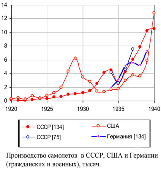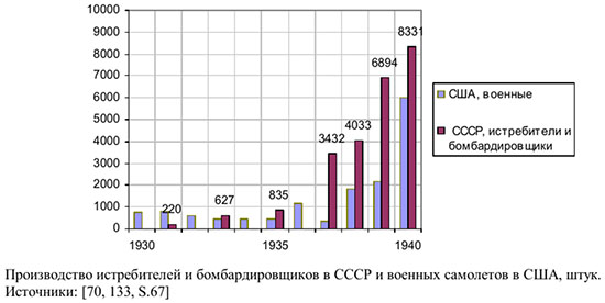 Ещё убедительнее выглядят сопоставления по военной авиации основных участников войны.  Как видно из диаграммы, гонка между Германией США и СССР началась с 1935 года и до 1940 года стало ясно, что в ней СССР и США, как минимум, не проигрывают.