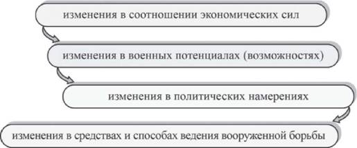 Как видно из примера темпов развития ВВП отдельных стран, взятых во временном отрезке до 2050 года, сделанных авторитетной консультативной фирмой, экономическая мощь (и военные потенциалы) отдельных стран и ЛЧЦ будут расти темпами более высокими и/или менее высокими, чем в среднем в мире. Это означает, что в относительно длительном периоде изменения в соотношении военных потенциалах неизбежны, что также неизбежно повлечёт за собой изменение в их военно-политических возможностях, а это, в свою очередь, повлечёт за собой вероятные изменения в намерениях правящих элит таких государств, ЛЧЦ и их коалиций. Наконец, эти изменения в политических намерениях неизбежно отражаются на поиске новых средств силовой борьбы и способах их применения.
