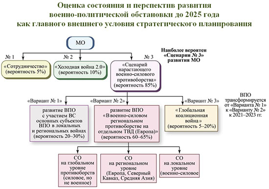 В 2013–2020 годах мною и коллегами по ЦВПИ была подготовлена серия работ, включая публикации, где были предложены негативные сценарии развития ВПО в качестве наиболее вероятных сценариев, а также их конкретные варианты. Как видно на рисунке ниже, формально-логически, мною был определен в качестве наиболее вероятного сценария развития МО до 2025 года «Сценарий № 3»[23] («Нарастающее военно-силовое противоборство»), который и должен был бы стать, по моему мнению, главным внешним условием для формирования целей стратегического планирования в России в соответствии с ФЗ № 390 от 28 декабря 2010 года «О безопасности» и ФЗ № 172 от 28 июня 2014 года «О стратегическом планировании в Российской Федерации»[24].