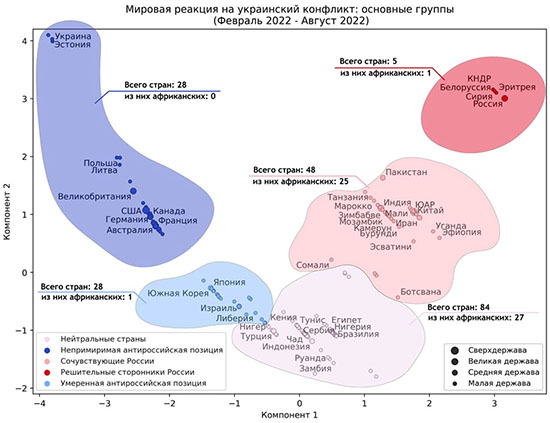 Очевидно, что соотношение сил в мире, характеризующее состояние МО-ВПО в 2022 году[17],  уже в следующем году изменилось. Оно отчасти характеризуется отношениями государств (в данном случае стран Африки), проанализированное сотрудниками НИИ МГИМО при помощи метода соотношения компонентов[18]. Авторы, в частности, делают вывод: Реакция на украинский кризис стала сложным явлением международных отношений. Многие страны в той или иной степени затушёвывают свою позицию, стараются, особенно на декларативном уровне, сделать её расплывчатой.