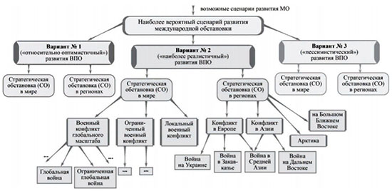 Как видно из рисунка ниже, базовый («наиболее реалистичный») вариант развития ВПО («Вариант № 2») предполагает два основных конкретных варианта развития стратегической обстановки (СО) в мире, каждый из которых не может быть исключен, но наиболее реалистическим является, безусловно, вариант развития «Стратегической обстановки в регионах».