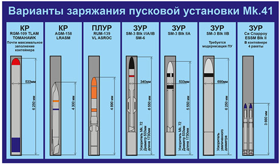 Важнейшее значение среди СВКН имеют крылатые ракеты большой дальности. По оценке российских специалистов, любая ракета может быть установлена в любую ячейку пусковой. Таким образом если корабль должен наносить удар по береговым целям, он возьмёт больше крылатых ракет RGM-109 (бывшая BGM-109), если в миссии на него возложена задача ПВО, то больше зенитных ракет. В одиночной миссии УВП будет заряжена преимущественно ЗУР и ПЛУР, в конвойной – противокорабельными, противолодочными и зенитными ракетами. И только в такой войне, как против Сирии, когда можно обстреливать противника, которому нечем дать сдачи, в Mk.41 могут оказаться 30-60 Томагавков. Но не 90 и тем более не 96. Постоянное присутствие эсминцев класса «Арли Бёрк» рано или поздно должно вылиться в крупную провокацию. Истерическое всемирное стенание по поводу «неизбежного нападения» России на Украину, не оставляет сомнений в том, кто и как послужит пушечным мясом в этой провокации[26].