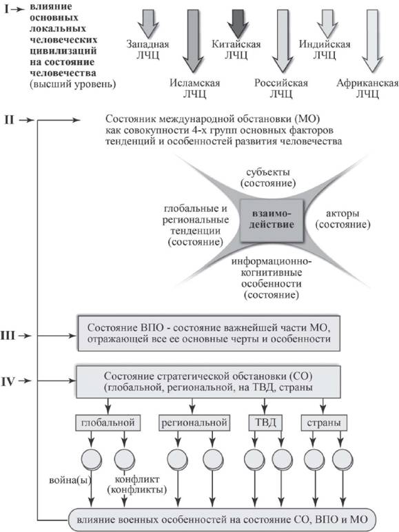 Изначально принципиально важно определить значение и место военно-политической обстановки (ВПО) как состояния и взаимовлияния многочисленных факторов[10] и отношений между ними относительно других состояний субъектов, факторов и отношений меду ними: прежде всего, международной обстановки (МО), стратегической обстановки (СО) в мире, регионах и на отдельных ТВД, а также войн и военных конфликтов. Иначе говоря, как соотносится состояние ВПО с состоянием более высоких уровней — человеческой цивилизации, с состоянием МО — и более низких уровней — с состоянием глобальной СО, а также состоянием СО на отдельных ТВД, региональными и локальными конфликтами и войнами»[11]