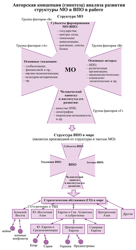 Данная тема не является предметом исследования, в том числе и потому, что она подробнее рассматривалась в других работах. В данном материале она приводится только для того, чтобы акцентировать внимание на политическом приоритете базового сценария развития МО и в последующем – ВПО. Важно предугадать логику эволюции развития современного состояния человечества и существующего миропорядка, – вытекающих из этой логики сценариев развития МО и ВПО, и их вариантов. Иначе говоря, суммируя рассуждения на эту схему: миропорядок – это состояние субъектов, акторов и отношений между ними и текущими тенденциями в МО, которые предопределяют основной сценарий развития МО и, как его следствие и логичное продолжение и развитие, – базовый сценарий ВПО[29].