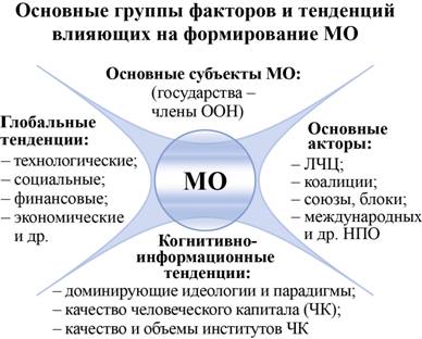 Как видно из отображённой структуры МО, представляющей основные 4 группы факторов и тенденций, их взаимодействие и взаимовлияние (порой противоречивое) формирует в основном современное состояние МО и закладывает самые общие основы для различных сценариев развития сценариев ВПО и их вариантов.