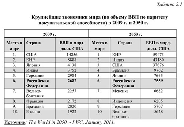 Еще в 2013 году было видно, что в перспективе крупнейшими экономиками мира становятся расположенные в Азии КНР и Индия (см. табл. 2.1), причем по абсолютным размерам ВВП (по ППС)уже в 2012 году ожидалось, что КНР обгонит США в 2017 г. Япония останется в числе 5 крупнейших экономик мира, но на ведущие позиции выдвигается также Республика Корея. Таким образом, еще в первом десятилетии нашего столетия было ясно, что в будущем произойдут радикальные изменения в расстановке экономических (а, значит, и политических) сил в мире, которые неизбежно повлекут изменения в структуре МО и ВПО и стратегиях государств.