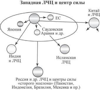 Как видно на рисунке, до 2050 года может сформироваться «пятиугольник», где каждый «угол» будет соответствовать той или иной ЛЧЦ, но с очень существенной оговоркой: западная ЛЧЦ и коалиция могут объединить не только североамериканский «угол», но и добавить к нему существенные «довески» от других ЛЧЦ – японской, исламской (КСА, например).