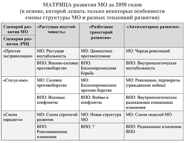 Из перечня этих и других тенденций в развитии человеческой цивилизации и сценариев развития МО можно для наглядности сделать простую матрицу, в которой упрощенно представить себе эту совокупность возможных направлений.