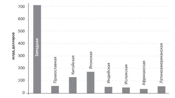 В то же время есть и другая сторона этой модели развития, которая может сформировать описываемый сценарий. По крайней мере, в настоящее время лидерству европейской цивилизации в затратах на научные исследования и разработки никакая другая цивилизация не угрожает (рис.). Только японская следует за ней с большим отставанием. Китайская пока лишь на третьем месте с еще большим отрывом от лидеров.