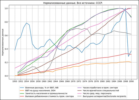 Сравним рис. 1 и рис. 2. Они содержат графики нормализованных данных по всем источникам для США и СССР за период 1950 — 1990 гг.