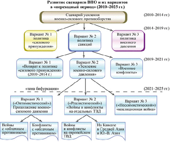 Поэтому, на мой взгляд, прежде всего базовые основы развития того или иного сценария ВПО и даже его конкретного варианта следует искать в развитии общих сценариев МО и отношений между главными субъектами и акторами. Как видно из рисунка ниже, с 2010 года мною и коллегами прогнозировалось, что развития базового сценария ВПО будет идти по следующему наиболее вероятному сценарию, названному «Сценарием усиления военно-силового противоборства», что полностью подтвердилось позже (хотя изначально и вызвало, как всегда, критику). В 2014–2020 годах этот сценарий развивался попеременно по одному из своих конкретных вариантов (не отличавшихся существенно друг от друга), который окончательно сформировался к 2020 году в «Вариант № 2» – «Усиление военно-силового давления». Ожидается, что этот вариант пройдет качественную точку «бифуркации» в период 2021–2025 годов, т. е. «переходный период», когда наиболее вероятным вариантом станет «Вариант № 2.2» – «Войны и конфликты на отдельных ТВД».