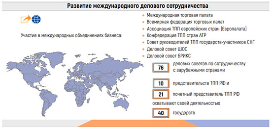 Институт торгово-промышленных палат – это общепризнанный во всем мире инструмент взаимодействия бизнеса разных стран. ТПП России обладает уникальными, исторически наработанными контактами по всему миру, зачастую выступающим основным каналом коммуникации между российским и зарубежным бизнесом. Зарубежные представители ТПП России охватывают своей деятельностью 40 государств. Опорным звеном в международной деятельности Палаты являются 76 деловых советов по сотрудничеству с зарубежными странами.