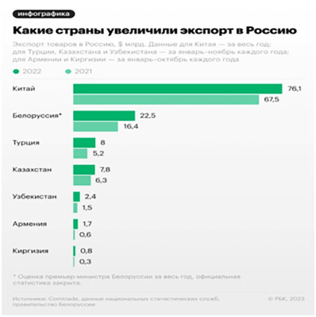 Между тем, по данным РБК от 29.01.2023, Турция, Белоруссия и Китай больше всех нарастили поставки товаров в Россию в 2022 году[16].