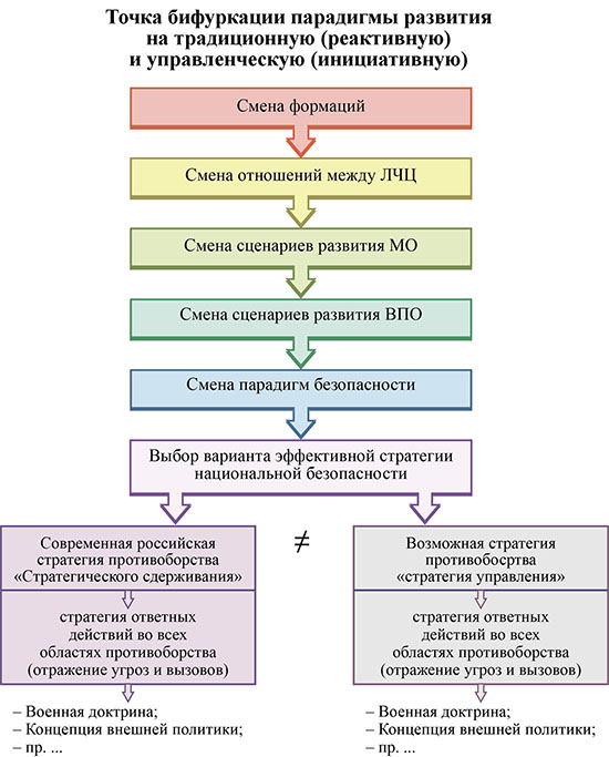 Традиционная парадигма национальной стратегии рассматривает стратегию как два относительно самостоятельных процесса – процесс социально-экономического развития и процесс обеспечения безопасности, прежде всего, военной, – которые развиваются не только автономно, но и нередко противоречат друг другу. Эта парадигма выражалась формулой «пушки вместо масла» (или наоборот), которая в 80-е годы приобрела в СССР искусственно антагонистическое значение: затраты на обеспечение военной безопасности стали по мнению части правящей элиты не просто непомерно высоки, но и вели к развалу экономики СССР[1].
