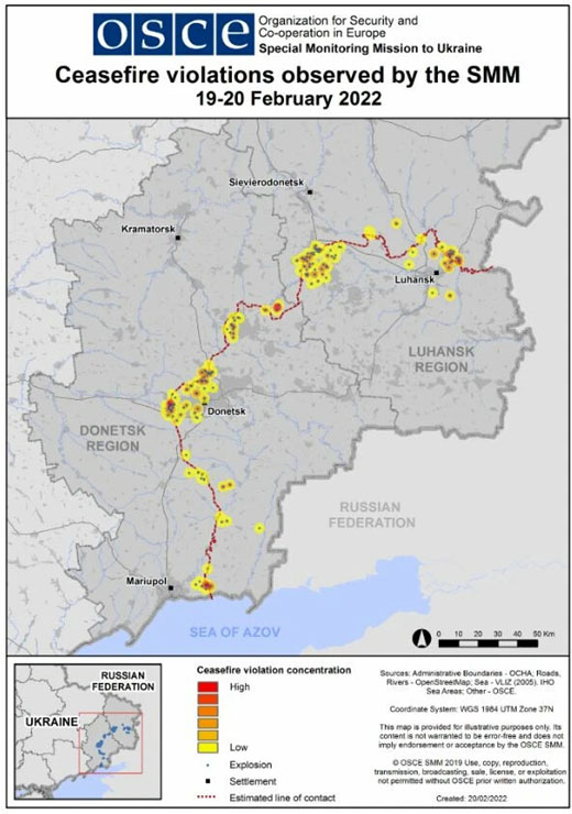 1). В Донецкой области с вечера 18 по вечер 20 февраля СММ зафиксировала 2 158 нарушений режима прекращения огня, в том числе 1 100 взрывов.
