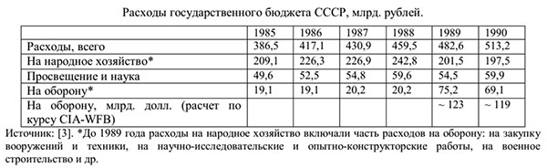 Как видно из данных ниже, в СССР даже существовала до 1989 года система, когда военные НИКР и военная промышленность статистически подсчитывались вместе с расходами на народное хозяйство. В «чистом виде» (расходы на содержание ВС) в 1985 году они составляли порядка 5%, но после того как они стали выделяться на военные НИОКР и закупку ВВСТ, они стали равняется порядка 7% общих расходов, т.е. можно предположить, что «военная» часть НИОКР и ВВВСТ оценивалась в советской экономике в 2,5–3%[12].