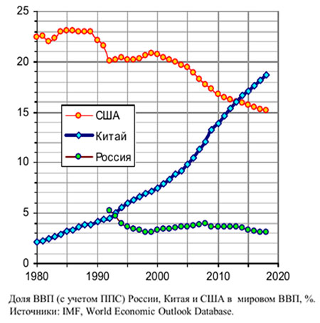 К сожалению, эти официальные признания и решения несут в себе очевидно запоздалый импульс. На протяжении последних 30 лет, а до этого еще и при существовании прежней партийно-хозяйственной системы, нарастало отставание, которое необходимо срочно ликвидировать. В первые годы правления администрации В.В. Путина эта задача стояла вполне отчетливо как задача «удвоения ВВП», т.е. роста ВВП не менее 7% в год, что удавалось какое-то время делать (до 2008 года) за счет количественного, экстенсивного роста, а не за счет ускоренного развития национального человеческого капитала. В итоге это привело к стагнации и стагфляции, которая выглядит особенно опасной на фоне быстрого роста и развития США и КНР. Если доля США в мировом ВВП и сократилась при сохранении абсолютного темпа роста, то КНР и целый ряд других стран продемонстрировали способность радикально изменить соотношение сил в мире. Так, например, по итогам 2021 года объем внешней торговли КНР за год вырос сразу на 22%, что вызвало крайне нервную реакцию в американском конгрессе. В целом же в исторической перспективе тенденции развития ВВП США, КНР и России выглядят крайне беспокойно, что отражено на следующем графике.