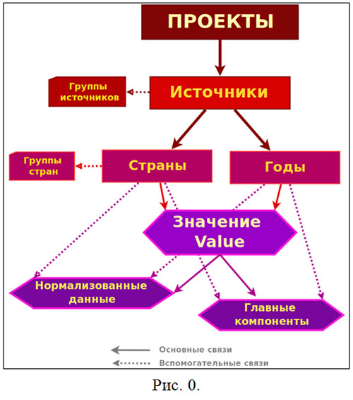 На рис. 0 приведена упрощенная схема иллюстрирующая архитектуру базы данных. Она приведена здесь для лучшего понимания принятых в этой работе терминов, относящихся к базе данных.