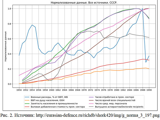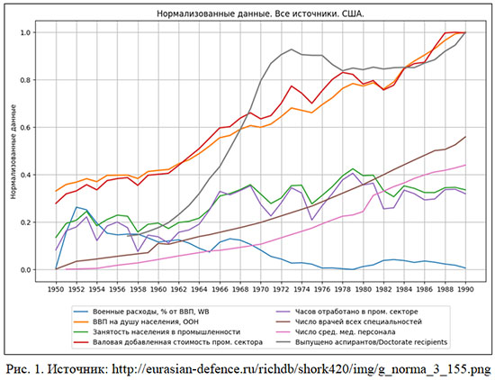 Сравним рис. 1 и рис. 2. Они содержат графики нормализованных данных по всем источникам для США и СССР за период 1950 – 1990 гг.
