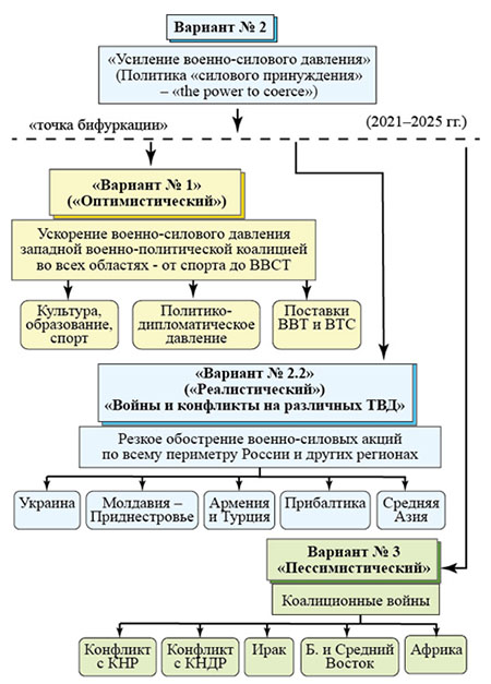 С одной существенной оговоркой: в отличие от предыдущих военных конфликтов с государствами «второго» и даже «третьего» порядка в военном отношении, этот вариант развития ВПО предусматривает возможное военно-силовое противоборство стран западной коалиции со всеми без исключения субъектами ВПО, включая лидеров локальных человеческих цивилизаций (ЛЧЦ), в том числе в форме вооруженной борьбы в региональных и локальных конфликтах, что резко увеличивает риск войны, в т. ч. глобальной[10].