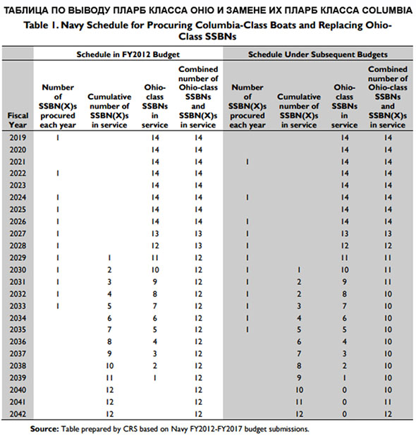 ВМС США сократятся до 11 или даже 10 ПЛАРБ в период 2029–2041 финансовых годов. Сокращение группировки новых ПЛАРБ SSBN(X) 5-го поколения до 12 единиц связано со следующим обстоятельством. Для каждой из 14 ПЛАРБ типа «Огайо» в середине срока службы для перезарядки ядерного реактора и проведения штатных регламентных работ требуется 3 года или более, в течение которых лодка выводится из эксплуатации. В то же время для ПЛАРБ 5-го поколения срок вывода в ремонт сократится до двух лет.