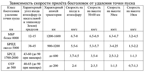 Российские специалисты[19] обращают внимание на то, что БЧ МБР и некоторые БРСД повышенной дальности, вроде отечественной РСД-10 (на Западе их называют ракетами промежуточной дальности, БРПД) используют другой метод сокращения участка, на котором их можно поразить: их аэродинамика оптимизирована, чтобы падение скорости было минимальным. БЧ МБР начинает экспоненциально терять скорость лишь на высоте около 30 км, но БЧ БРПД/БРСД из-за меньшей скорости на входе в атмосферу и другого угла падения начинает тормозиться уже на высоте 60 км. В итоге на цель она выходит с примерно той же скоростью, что и БЧ устаревших форм, или ОТР: те же плюс-минус 3 Маха. Но до такой скорости она затормозится на высоте менее 7 км, а выше, по причине гиперзвуковых скоростей, перехватить ее сможет далеко не каждый ЗРК. Типичные параметры движения БЧ разных классов на конечном участке можно свести вот в такую таблицу: