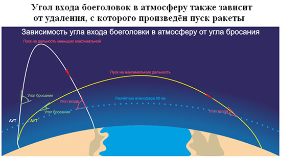 Зависимость угла входа боеголовки в атмосферу от удаления точки старта