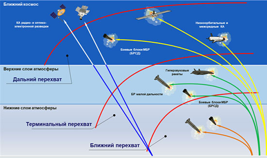 Схема эшелонированной системы противоракетной обороны (для перехвата МБР и БРПЛ) в упрощенном виде выглядит следующим образом: