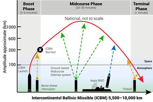 При этом, в нем учитывались возможности американской системы наземной обороны на полпути (GMD) ; планируемый перехватчик следующего поколения (NGI); корабельная система « Иджис» ВМФ, первоначально предназначенная для перехвата баллистических ракет малой, средней и средней дальности, которая в настоящее время рассматривается для перехвата межконтинентальных баллистических ракет на полпути; армейская система терминальной высотной обороны (THAAD) ; и потенциальные системы фазы разгона, использующие либо удар на поражение, либо направленную энергию. Исследование выявило проблемы с каждым из них»[12], – констатируется в докладе МО США.