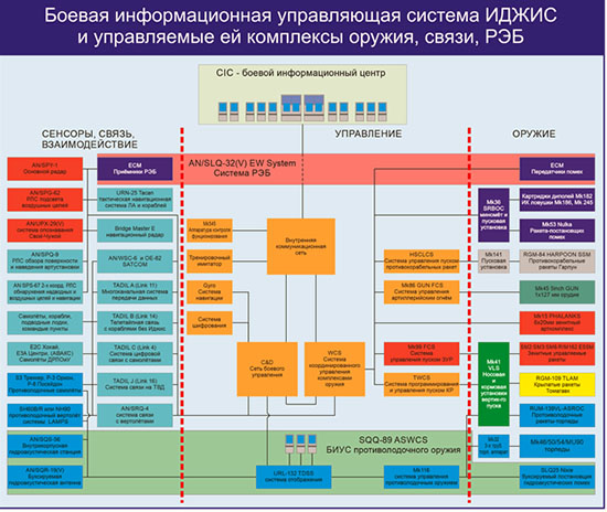 Нет никакой «Системы ПРО Иджис», справедливо считает сотрудник МГИМО МИД РФ В. Каберник[14]. И «ЗРК Иджис» нет, хотя это утверждают тысячи экспертов и даже святая Википедия. Есть корабельная Боевая Информационная Управляющая Система – БИУС Иджис (нынче в моде термин МСУО – многофункциональная система управления оружием), которая решает целую кучу задач. В том числе и ПВО и ПРО. Но только в том числе! Эта система управляет на корабле вообще всем. Вот её структурная схема. Собственно противоракетную функцию в ней выполняют только два элемента этой схемы – основной радар AN/SPY-1 и противоракета SM-3».