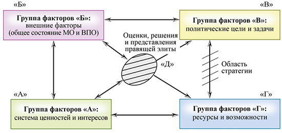В этой связи необходимо вернуться к самой общей модели формирования внешней политики абстрактного государства-субъекта ВПО, и места в ней собственно национальной политической стратегии, которая является её неотъемлемой частью. Как видно из рисунка, центральное место в формировании национальной стратегии занимает группа факторов «Д», - представления и оценки правящей элиты страны, от субъективной оценки которой зависит как представление о национальных интересах (группа факторов «А»), значения внешних факторов (группа факторов «Б»), политические цели и задачи (группа факторов «В») и ресурсы (группа факторов «Г»).
