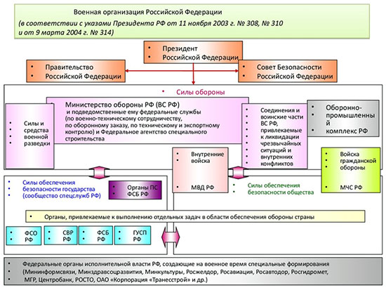 Современная военная организация России сохраняет в себе все отрицательные черты военной организации СССР последних лет, добавив низкую эффективность военного управления. Она сводится практически к управлению силовыми государственными институтами. И только, хотя пример организации ГКО СССР в июле 1941 года свидетельствовал о других возможных вариантах решения. Как видно из рисунка ниже, военная организация РФ – это большая часть ФОИВ, ВС и вооруженных формирований, а также предприятий ОПК.
