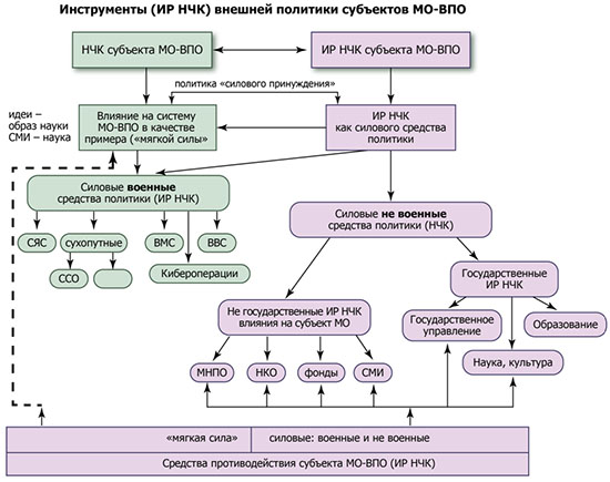 Эти же ИР НЧК становятся важнейшими инструментами силового влияния в политике (пока что в меньшей степени собственно в военной, но уже в интересах политики безопасности). Эту структуру инструментов влияния внешней политики субъекта МО-ВПО, состоящих из государственных и негосударственных ИР НЧК, можно условно изобразить следующим образом[18]: