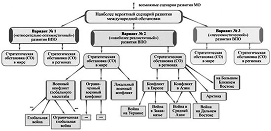 Как видно из рисунка ниже, базовый («наиболее реалистичный») вариант развития ВПО («Вариант № 2») предполагал два основных конкретных варианта развития стратегической обстановки (СО) в мире и в отдельных регионах, каждый из которых не мог быть исключен, но наиболее реалистическим является, безусловно, вариант развития «Стратегической обстановки в регионах». Этот вариант СО предполагал нарастание вероятности конфликтов в Европе, Азии, на Большом Ближнем Востоке и в Арктике.
