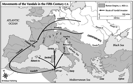 В 406 году орды варваров под общим командованием Радагайса переправились через Рейн и ворвались на территорию Западной Римской империи. Во вторжении участвовало множество племен, германцы атаковали на нескольких направлениях, и пока римляне отражали Радагайса в Италии, к северу от Альп племя за племенем проникало во внутренние провинции империи. Вторжение продолжалось, и трон короля занял его единственный законнорожденный сын Гундерих. Старший брат нового короля, которого звали Гейзерих, был рожден от наложницы и не мог претендовать на престол, но вскоре, в качестве соправителя стал вторым по влиянию после короля, а после смерти брата создал империю и правил 50 лет.