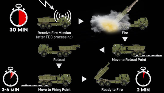 Время заряжания в данном случае важно учитывать, поскольку одна установка (если речь идёт об М270 с двумя модулями) может одновременно нести только один вид боеприпаса. Поэтому при получении данных необходимо снарядить именно его, если заранее был неизвестен характер цели. Быстрая скорость перезарядки с помощью модулей в свою очередь выдвигает требования к обеспечению. Каждая батарея имеет в составе взвод обеспечения в составе из 4 тягачей с прицепами. Таким образом, возможно транспортировка 32 модулей БК. Это по 4 перезарядки на машину для батареи из 8 HIMARS или по 2 на MLRS.