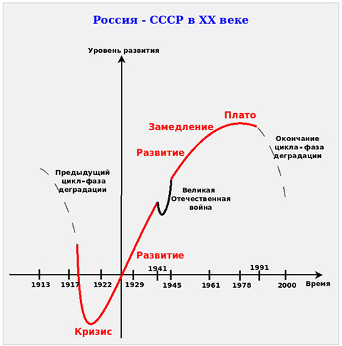 Исторически этот график может выглядеть таким следующим образом, как показано на рисунке. Можно спорить о деталях – этот график слишком абстрактен, но, тем не менее видно, что в развитии цивилизаций присутствует цикличность, подтверждаемая историческими наблюдениями, а, главное, фаза «деградация» и распад.